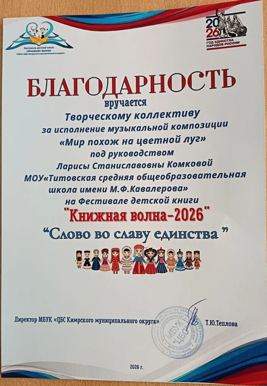 27 марта учащиеся 3 класса нашей школы приняли участие в муниципальном фестивале детской книги и чтения «Книжная волна-4», который в этом году проходил под названием «Слово во славу единства».Фестиваль ежегодно объединяет юных читателей, любителей книги и творчества со всего Кимрского муниципального округа. В этом году он был посвящен важным темам: сохранению исторической памяти, единству поколений и любви к Родине.